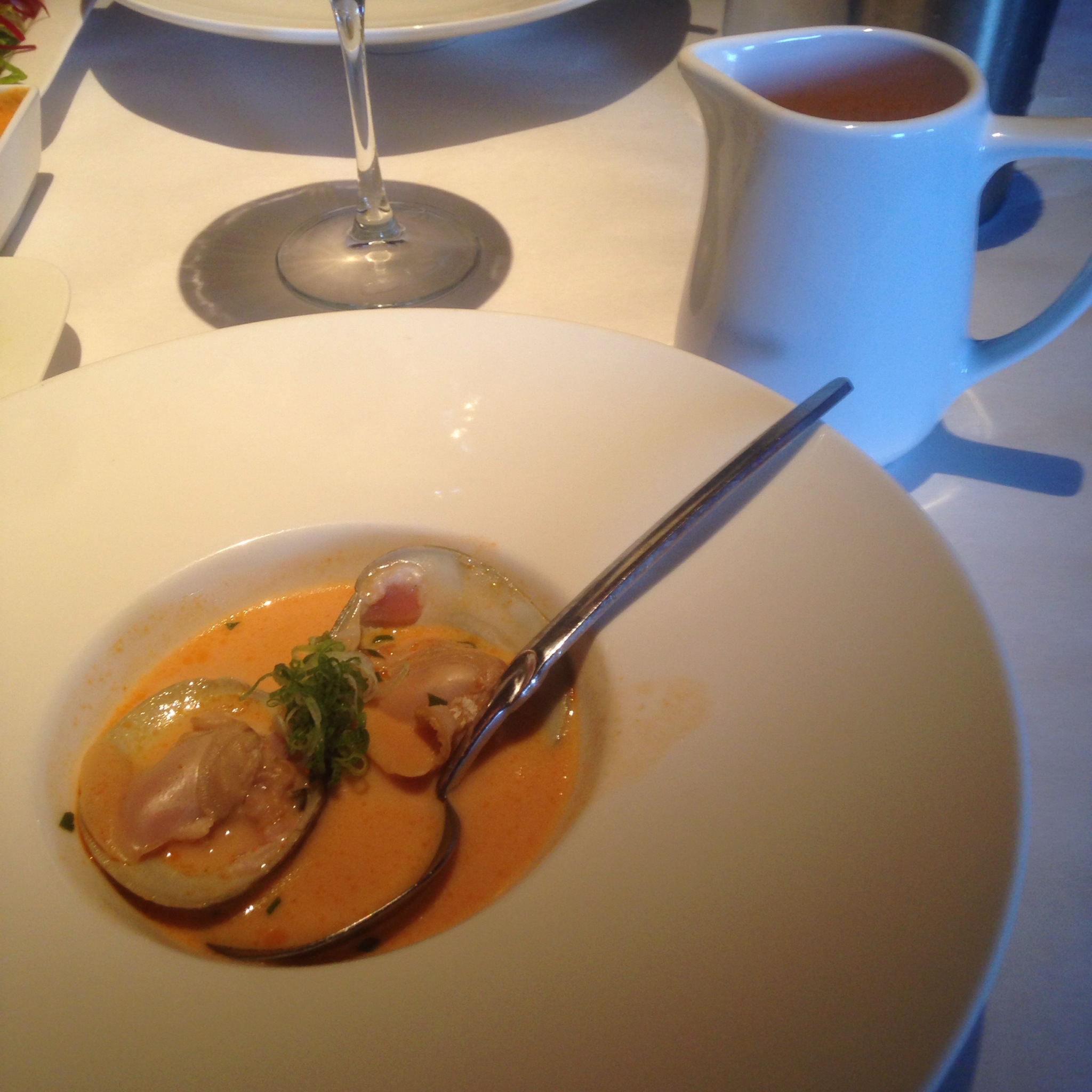 When we were first seated, Bernard asked us if we eat spicy food. I told him I eat everything while Jen told him she couldn’t handle the heat. “Terriyaki sauce is spicy to me.” Unfortunately for her he had already chosen what we were going to eat. Next up was soup, but it wasn’t basic miso. Nope, we had the red seafood bisque with clams and a picante broth. At first neither of us knew what it was. It was served in a bowl with a miniature glass pitcher of additional soup. It was not too spicy, but definitely had a kick to it. It was light and the clams were tasty with the broth from the soup. Jen was not a big fan due to the heat, but we agreed that it was still good and were enthusiastic as to what was coming next.